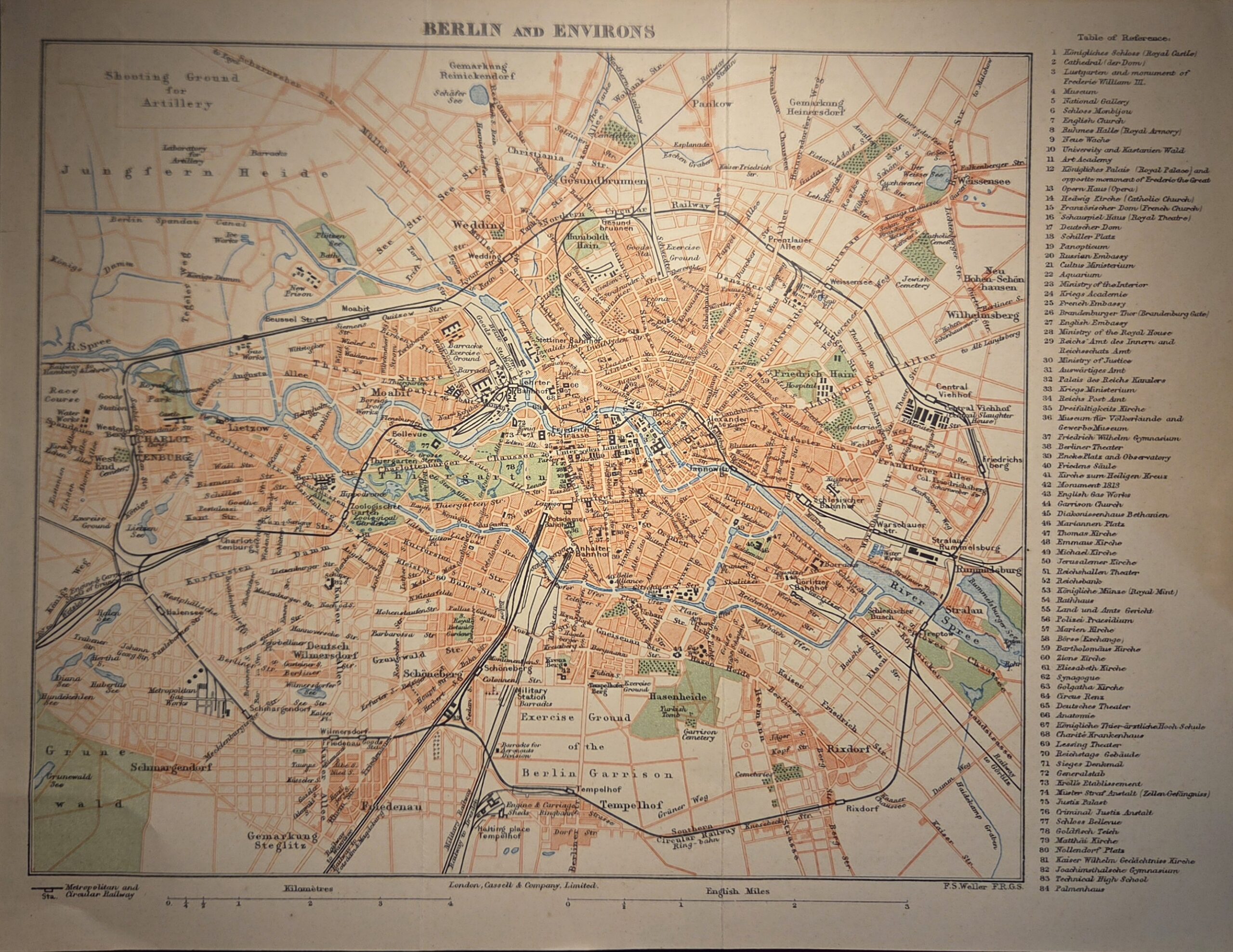 Major thoroughfares, railway lines, and natural features such as rivers and forests are carefully delineated, while smaller villages and suburban developments are also marked, giving a comprehensive view of Berlin’s environs before the city’s later expansion. The engraving bears the initials F.R.G.S., underscoring Weller’s professional standing as a Fellow of the Royal Geographical Society.