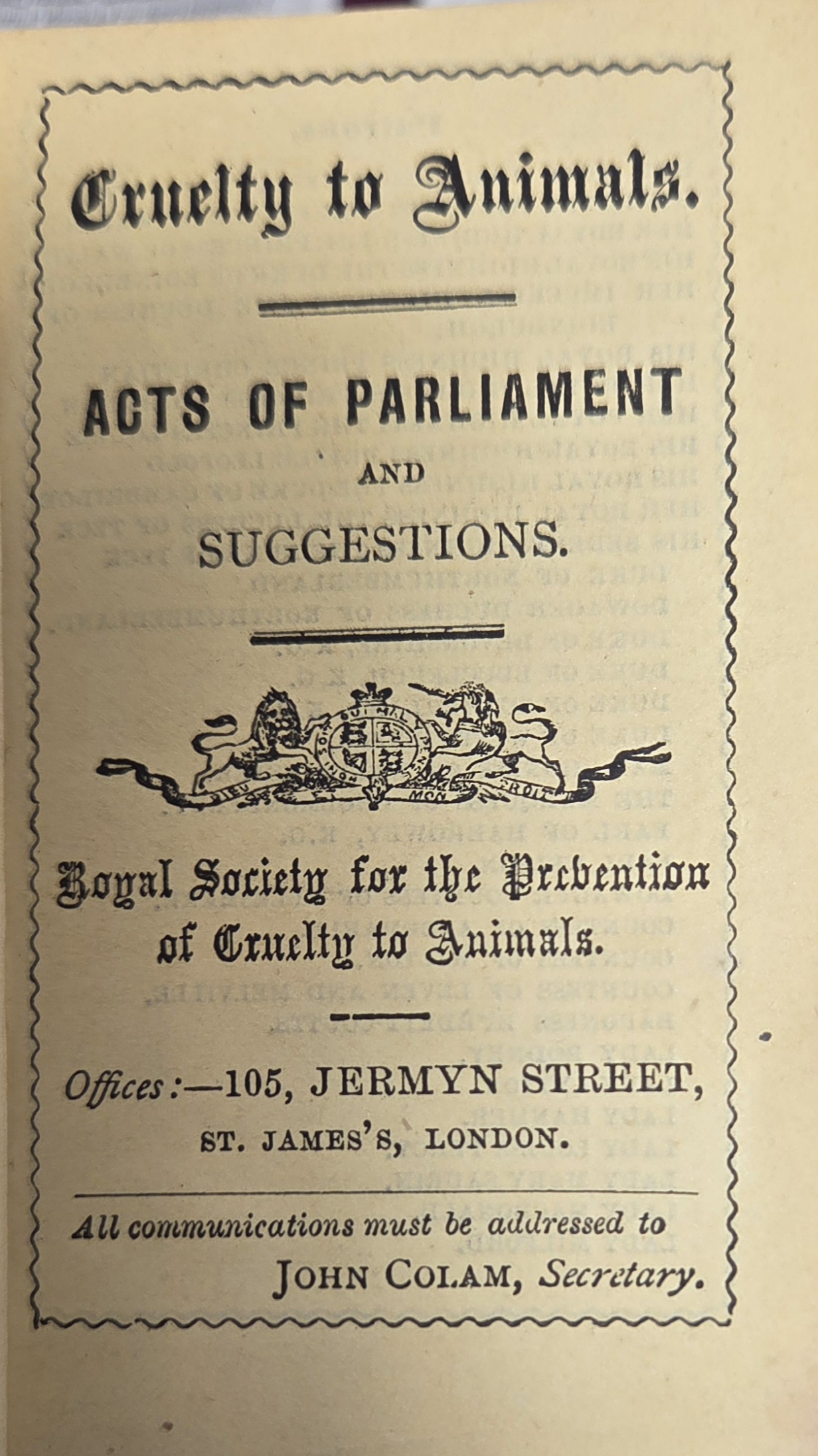 Cruelty to Animals: Suggestion, Acts of Parliament, Prosecutions is a late-19th-century practical reference compiling British legislation and case law on animal welfare. Published around 1895, this compact volume measures approximately 6.5cm x 10cm, making it highly portable for magistrates, society officers, and legal practitioners. The book reproduces the text of relevant Acts of Parliament addressing cruelty to animals, offers suggested procedural guidance, and summarizes notable prosecutions to illustrate the application of the law. Its aim was to provide both legal clarity and practical instruction for enforcement and compliance. By combining statutory excerpts, enforcement recommendations, and case examples, it served as a handbook for officers and activists seeking to prevent animal abuse in Victorian Britain. The size and format made it a convenient reference in court, for field use, or as a personal guide to understanding the evolving legal protections for animals during this period.