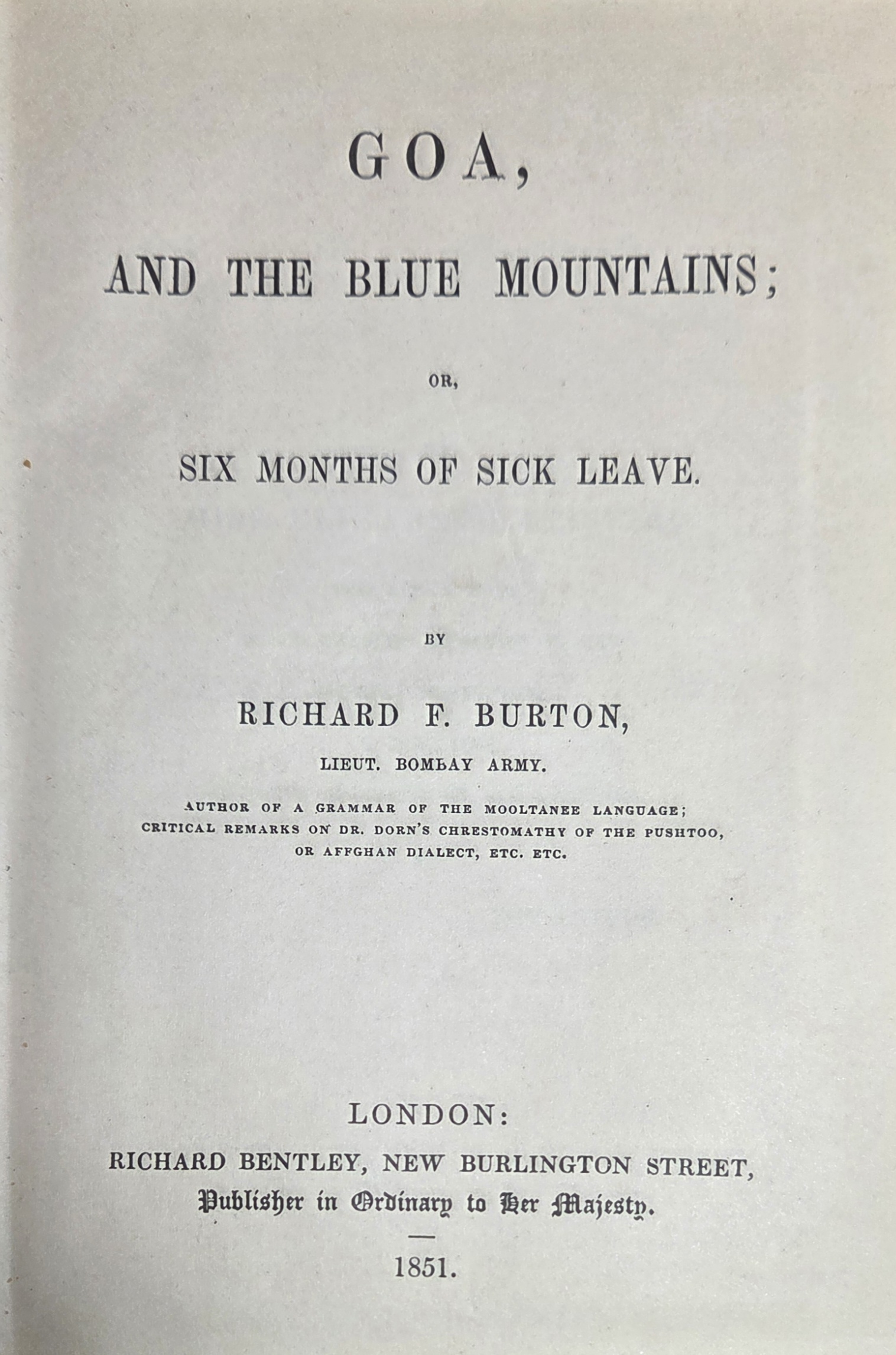 Goa, and the Blue Mountains; or, Six Months of Sick Leave by Richard Francis Burton is an early travel narrative based on Burton’s time in India while serving with the East India Company. Written during a period of medical leave, the book recounts his journey to Portuguese-controlled Goa and onward to the Nilgiri, or Blue, Mountains of southern India. Burton offers detailed descriptions of the tropical landscape, colonial society, and the cultural blend created by centuries of Portuguese rule. He comments on religion, caste, local customs, missionary activity, and the daily life of both European settlers and Indian communities. Characteristically candid and analytical, Burton combines sharp observation with satire, often critiquing colonial attitudes and institutions. The work reveals his early interest in languages, ethnography, and comparative religion interests that later defined his more famous explorations in Arabia and Africa and already displays the independence and curiosity that shaped his career.
