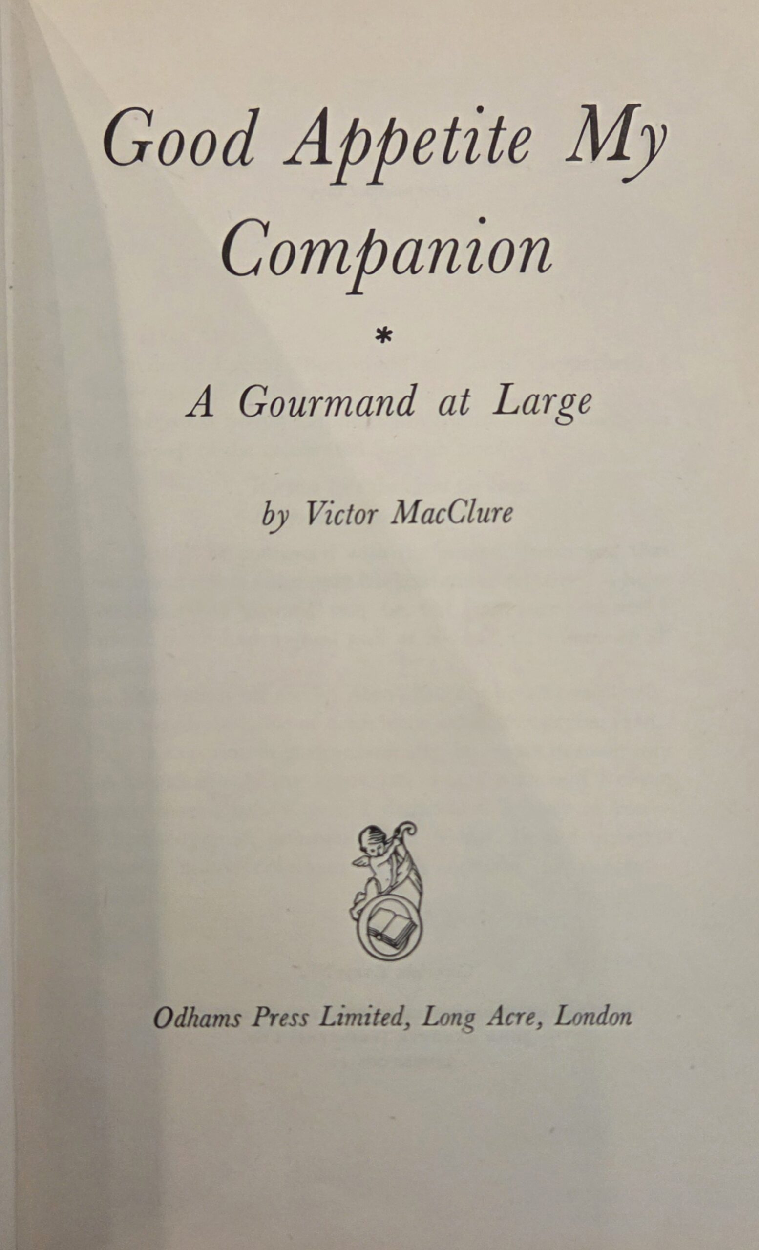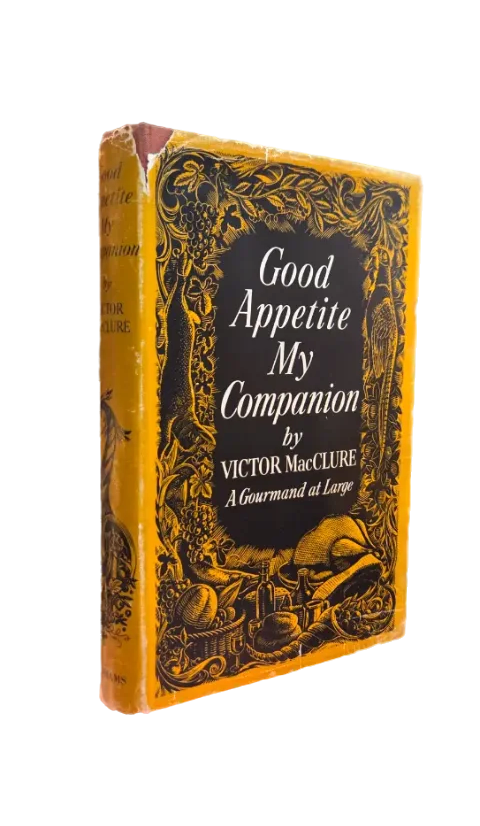 Good Appetite My Companion: A Gourmand at Large by Victor MacClure is a lively memoir and exploration of mid-twentieth-century gastronomy. Rather than a conventional cookbook, the book combines personal anecdotes, culinary observations, and reflections on the pleasures of eating and dining. MacClure writes as a self-described gourmand, sharing his experiences with different cuisines, both in Britain and abroad, while celebrating the social and cultural dimensions of food. The narrative is rich with descriptions of flavors, meals, and cooking practices, conveying both the author’s enthusiasm and his curiosity about culinary traditions. Illustrated throughout, the book adds a visual element that complements the vivid storytelling. Beyond recipes and menus, it offers a window into the gastronomic culture of the 1950s, capturing the tastes, habits, and attitudes of the period. Good Appetite My Companion remains a valued work for food enthusiasts and historians interested in classic food writing and the art of appreciating cuisine.