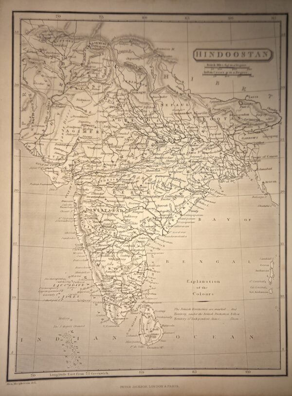 Hindoostan, 1820 — published by Peter Jackson, London, and Macpherson, Paris, this finely engraved map presents a detailed depiction of India (Hindoostan) at the beginning of the 19th century, a period marked by the consolidation of British colonial administration and growing European commercial interest. The map provides comprehensive coverage of major cities, towns, rivers, mountain ranges, and important political and administrative divisions, offering both geographic and strategic insights into the subcontinent.