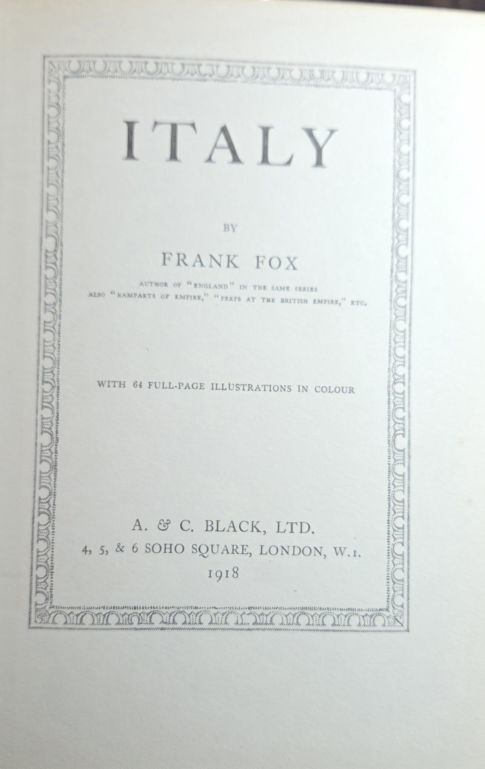 Italy by Frank Fox, published in 1918, is a travel and cultural study of Italy written during the final year of the First World War. Fox, a journalist and war correspondent, presents Italy not only as a land of artistic and historical richness but also as a modern nation engaged in the Allied war effort.