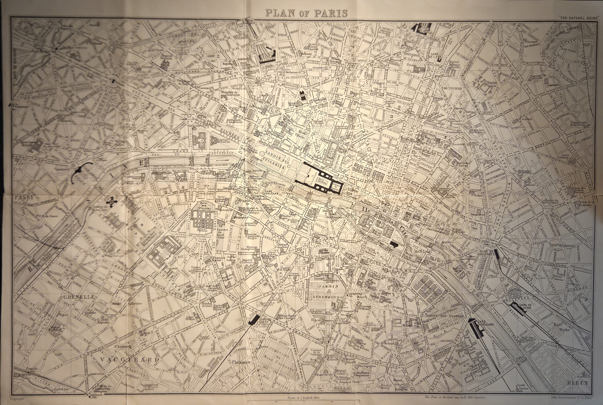 The Plan of Paris Map from the 1929 Satchel Guide was produced by John Bartholomew & Son, Ltd., a respected cartographic firm. This map offers a meticulously composed portrait of Paris during a pivotal historical moment. Its lines are precise yet expressive, capturing a city still shaped by nineteenth-century planning even as it modernizes. Major boulevards, monuments, and transit lines are clearly delineated, serving both as navigational beacons and cultural markers. The Seine bisects the map with quiet authority, reaffirming its role as the city’s central spine. Metro stations are carefully mapped, signaling a burgeoning network attentive to urban growth. Compact but rich in detail, the map strikes a refined balance between utility and design—guiding travelers through a Paris steeped in history, sophistication, and civic ambition.