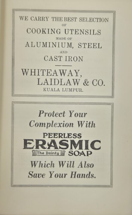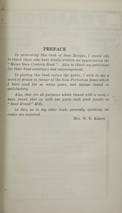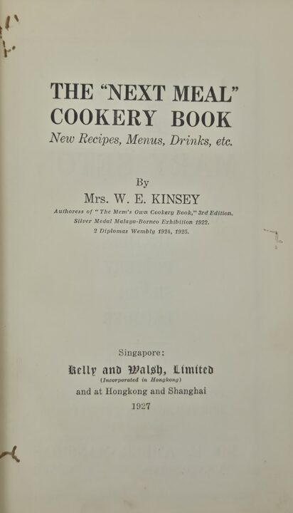 Mrs Kinsey was a British ex-patriate who lived in Seremban Malaya with her husband, a businessman, mines inspector, and forestry officer. In 1920 she wrote a bestselling cookbook The Mem’s Won Cookery Book published in Singapore by Kelly & Welsh for European women keeping house in Malaya claiming “five years of practical experience”. The 420 recipes were practical, often using local measures or prices and ingredients, written not for the archetypical Colonial housewife who relied wholly on servants, but “to help those mems’ who are keen on taking advantage of the possibilities of catering in this country”. The recipes were also written longhand, and not in the formal economical method common to British cookbooks post Beeton. Notwithstanding this difference, Mrs Kensey has been described as “Mrs Beeton of Malaya” due to the success and influence of her books.