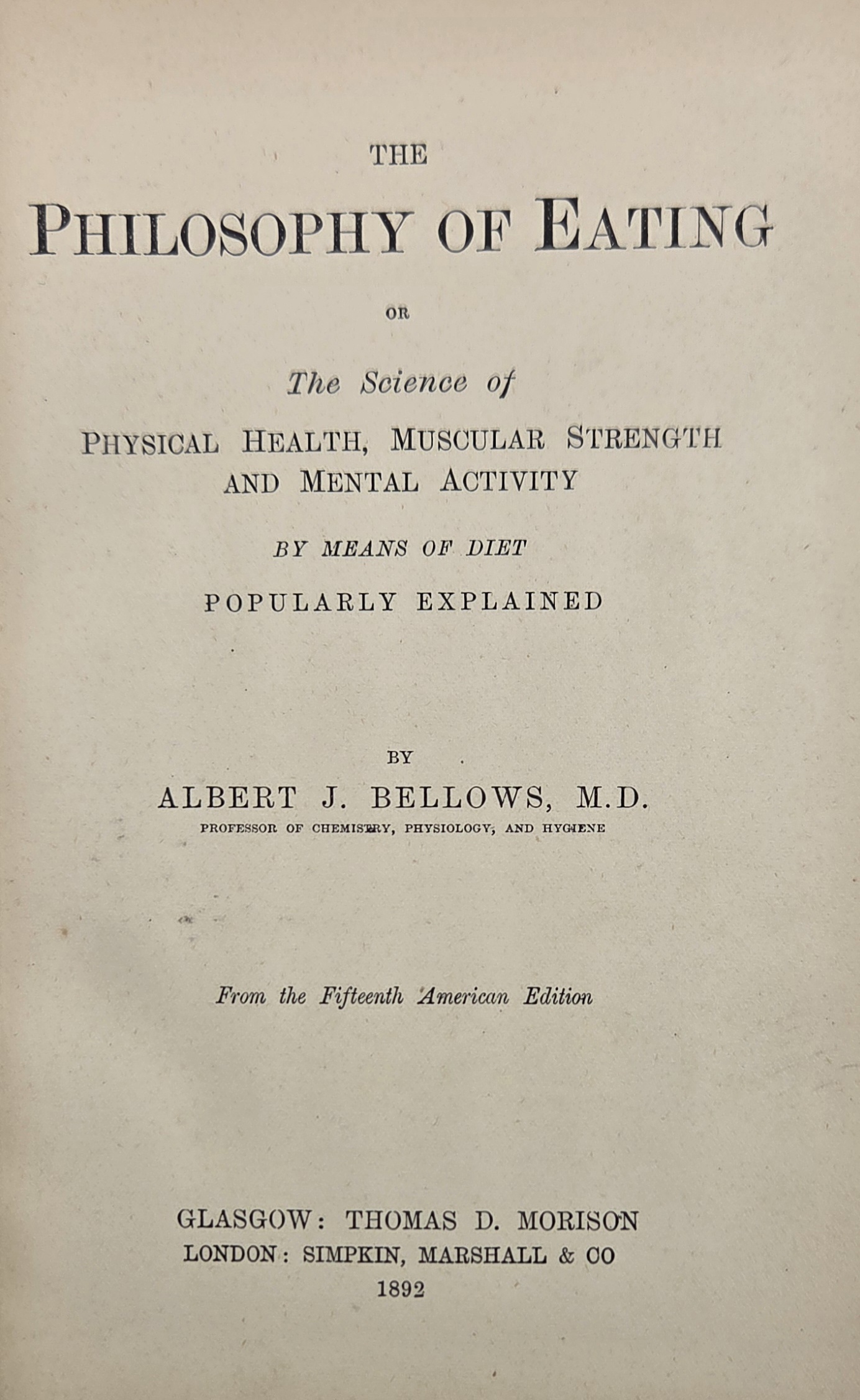 The Philosophy of Eating by Bellows, published in 1892, is a nineteenth-century exploration of diet, health, and the relationship between food and human wellbeing. Written from a scientific and moral perspective, the book argues that many physical ailments arise from improper eating habits rather than disease alone. Bellows examines the nutritional qualities of different foods and explains how digestion, balance, and moderation are essential to maintaining health. He stresses the importance of natural, unadulterated ingredients and criticises excessive reliance on stimulants, refined foods, and overindulgence. The work also connects food to broader themes such as agriculture, environment, and social habits, suggesting that healthy eating is both a personal responsibility and a foundation of a healthy society. Although some ideas reflect the medical thinking of its time, the book is notable for its early emphasis on nutrition as a science. It offers readers practical guidance while encouraging thoughtful reflection on the role of diet in daily life and long-term wellbeing.