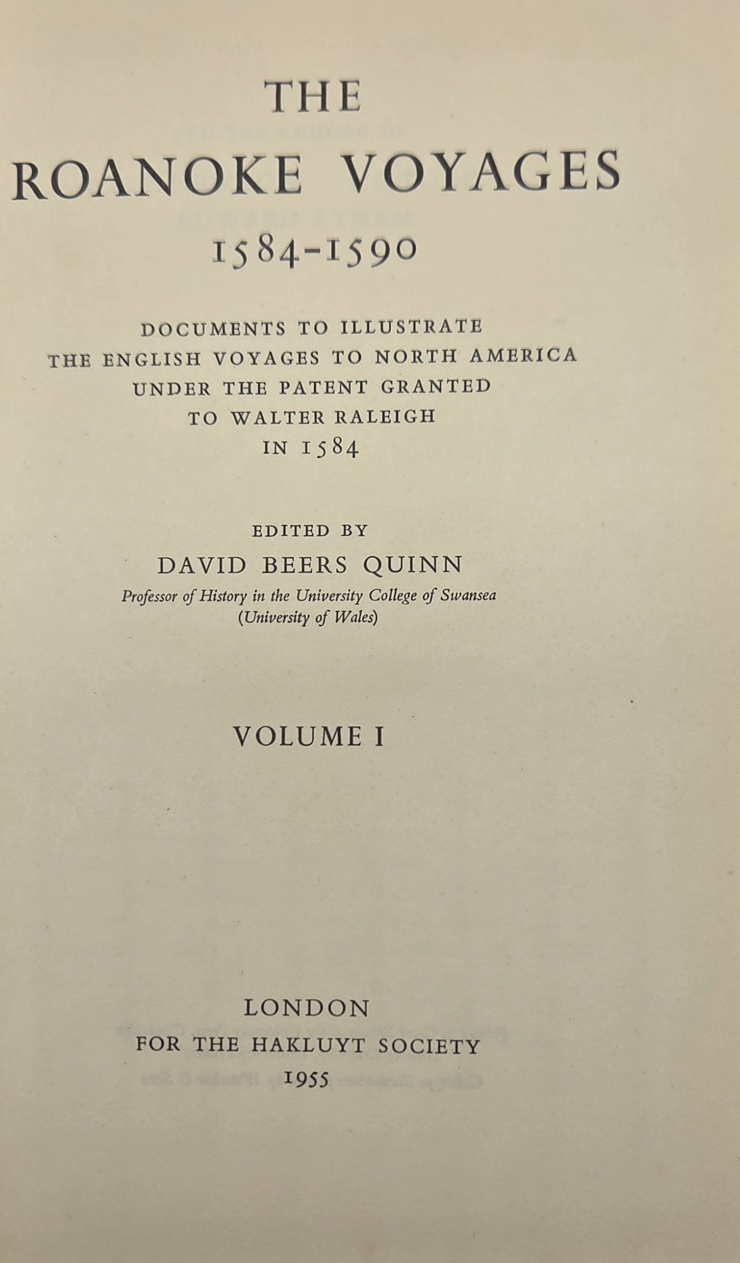 The Roanoke Voyages, 1584-1590: Documents to Illustrate the English Voyages to North America under the Patent Granted to Walter Raleigh in 1584 was published in 1955 and edited by the historian David Beers Quinn. The volume brings together a carefully selected body of primary source material relating to England?s earliest attempts at colonisation in North America.