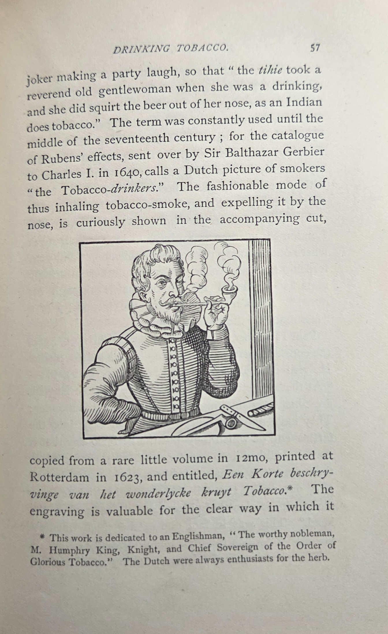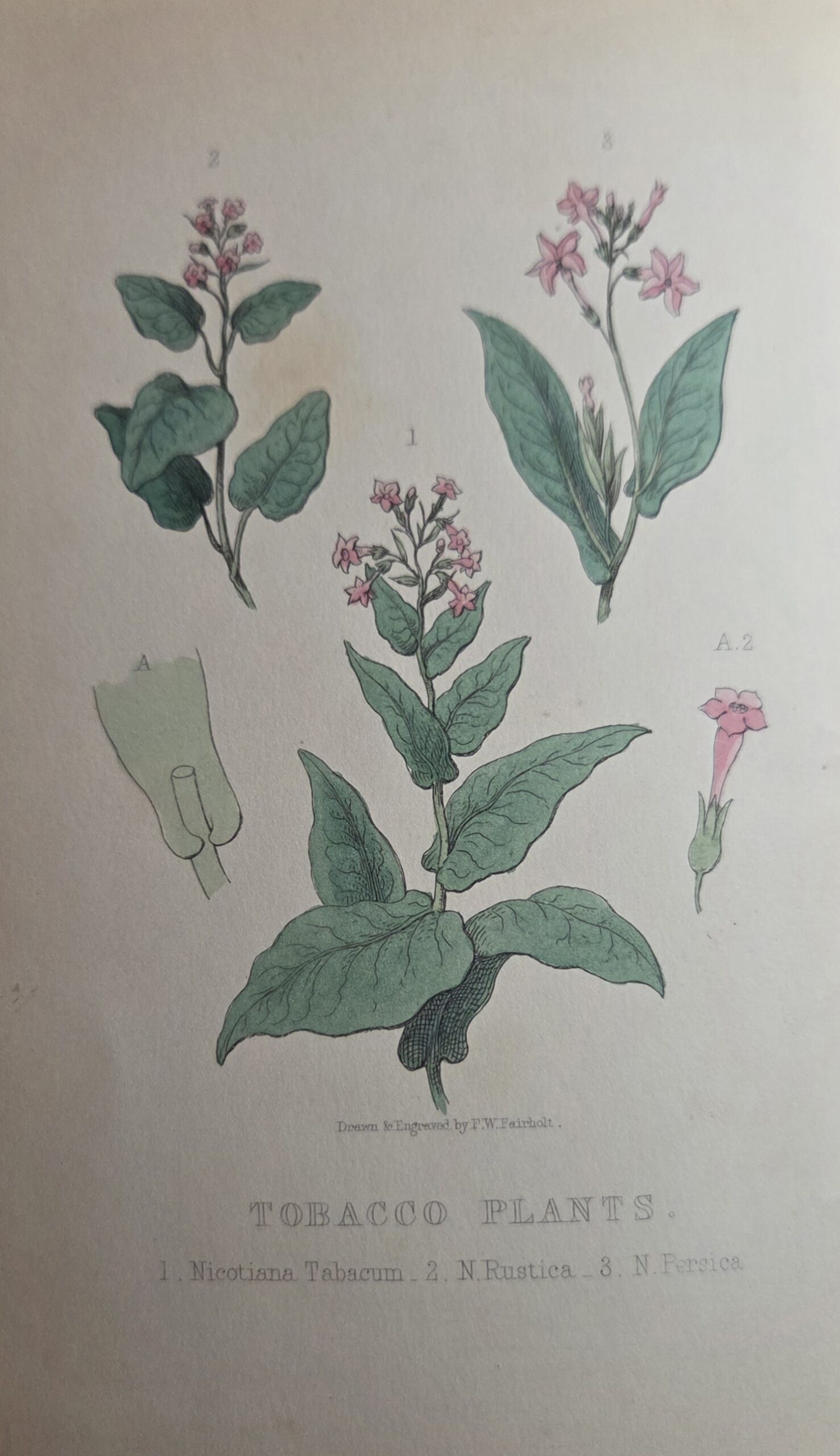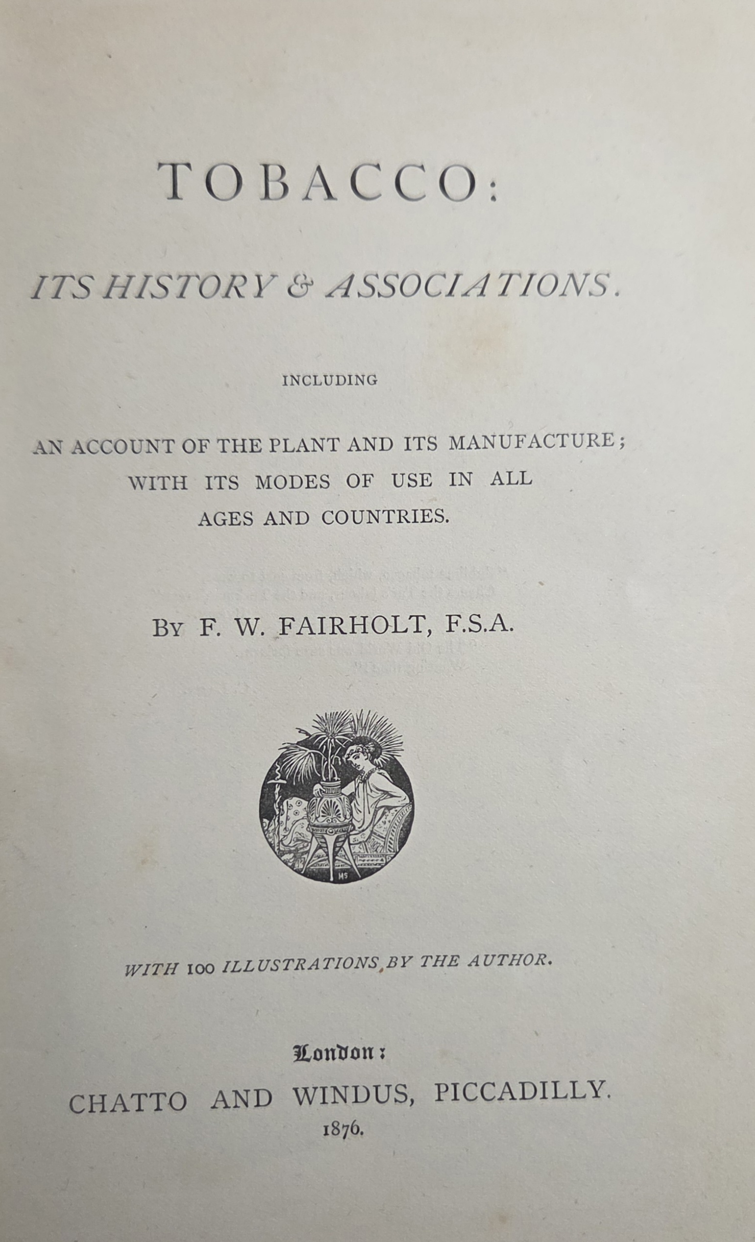 Adorned with over one hundred of Fairholt’s own detailed woodcut illustrations, the work serves as a vital visual and textual record of nineteenth-century habits and heritage. It remains an essential reference for understanding how a simple leaf became entwined with the social identity, economy, and artistic expression of the modern world, making it a cornerstone for any collection focused on the history of social customs and antique curiosities.